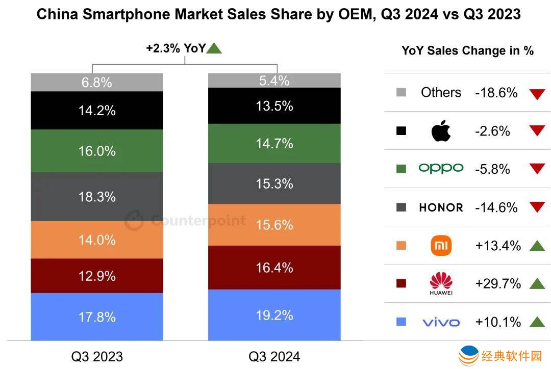 在全球市场中,排名前10的机型占据了智能手机总销量的19%,这一数据进一步凸显了头部机型在市场中的主导地位。同时,报告还指出,2024年第三季度,中国智能手机市场也呈现出积极的增长态势,同比增长了2.3%,有望实现五年来的首次年增长。
