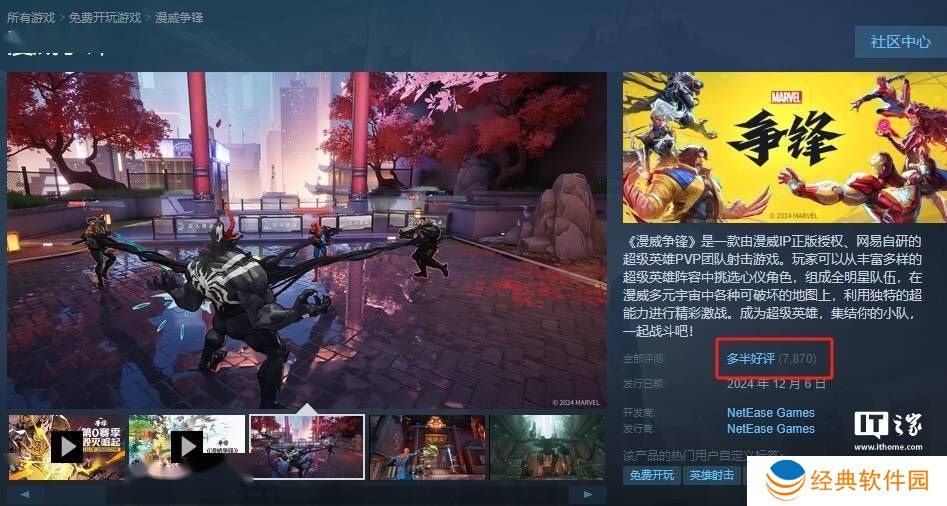 据SteamDB平台数据显示,《漫威争锋》在公测首日便取得了显著成绩,其24小时内的Steam峰值在线人数高达44.4万。不仅如此,这款游戏在用户评价方面也表现出色,7870篇用户评测中,有75%给出了好评,使其收获了“多半好评”的评价。