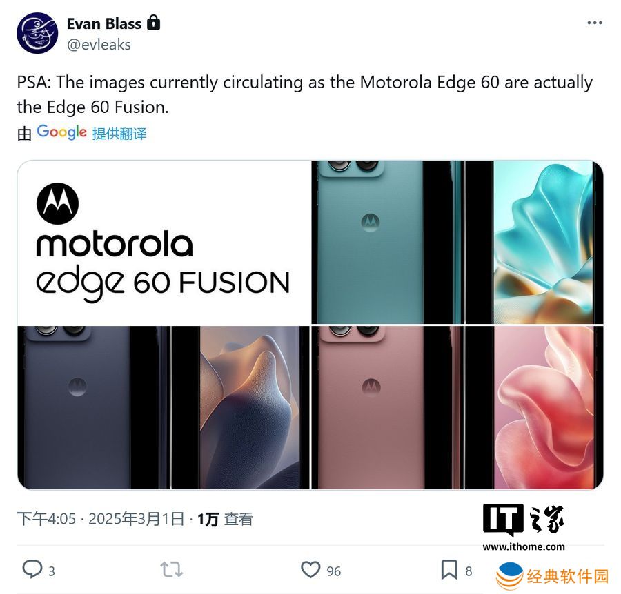 本站 3 月 2 日消息,消息源 Evan Blass(@evleaks)昨日(3 月 1 日)在 X 平台发布推文,分享了摩托罗拉 Edge 60 Fusion 手机的高清渲染图,采用曲面屏和极窄边框设计。
