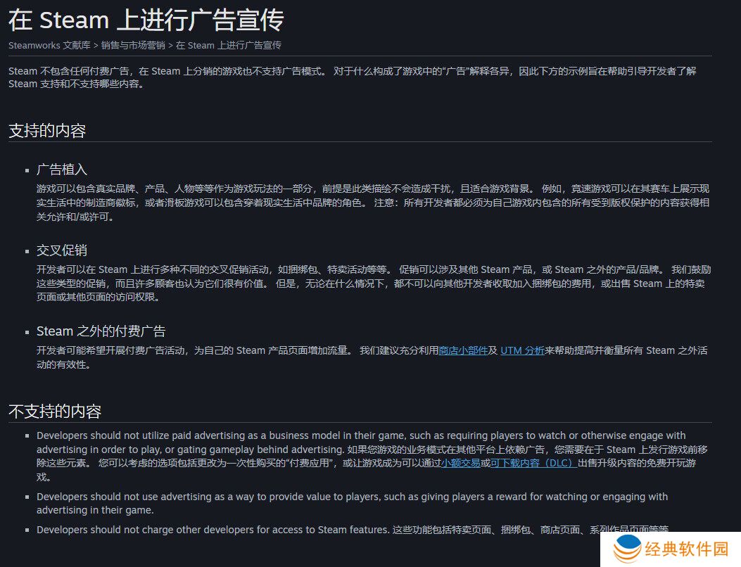 此外,V社还明确表示,Steam平台上的游戏不支持付费广告模式。如果游戏的商业模式依赖于其他平台上的广告,开发者需要在Steam上发布游戏之前删除这些广告元素。这一规定旨在确保Steam平台的游戏环境公平、公正,避免让广告干扰到玩家的游戏体验。