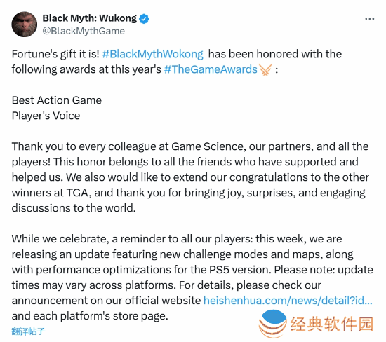 颁奖典礼结束后,《黑神话:悟空》的官方团队迅速在海外社交媒体上发表感言,向所有支持者和参与者表达了深深的谢意。他们表示:“这份荣誉不仅属于我们游戏科学的每一位成员,更属于所有支持、鼓励并陪伴我们一路走来的朋友们。我们由衷地感谢每一位合作伙伴和玩家,是你们的信任与热爱让我们得以站在这个舞台上。同时,我们也向其他获奖者致以最诚挚的祝贺,感谢你们共同为游戏世界增添了无尽的乐趣与惊喜。”