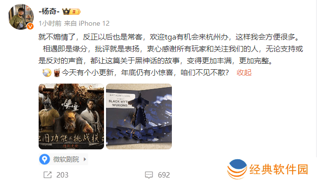 在杨奇的微博中,他并未过多渲染情感,而是真诚地感谢了所有支持和关注《黑神话:悟空》的玩家。他表示,无论是批评还是表扬,都是游戏成长道路上不可或缺的宝贵财富,它们共同塑造了游戏更加丰富和完整的故事。