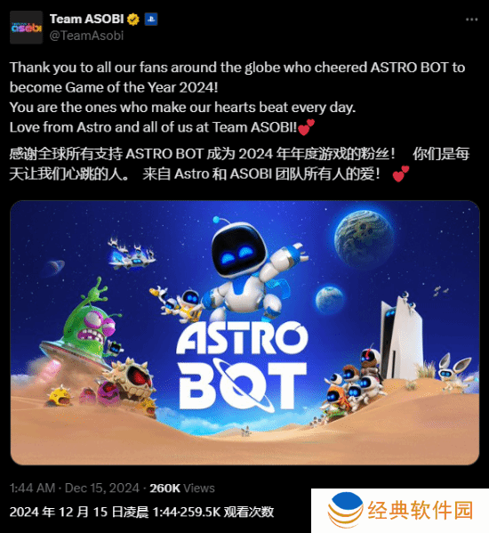 获奖消息一经公布,Team ASOBI工作室立即通过官方渠道发表了一篇感言,向全球范围内支持《宇宙机器人》的粉丝们表达了深深的感激之情。工作室在文章中深情地写道:“正是有了全球粉丝们的坚定支持与热爱,才让《宇宙机器人》得以站在这个荣耀的舞台上,荣获2024年度最佳游戏的奖项。你们的热情与鼓励,是我们不断前行、持续创新的不竭动力。”