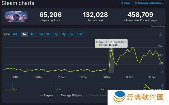 近期,《绝地潜兵2》这款游戏在玩家群体中掀起了一股热潮。据SteamDB平台的统计数据,自12月13日以来,该游戏的同时在线玩家数量实现了飞跃式增长,从原本稳定的1至2万人激增至12至15万人的规模,并在随后几天内达到了惊人的150153人同时在线的新高峰。
