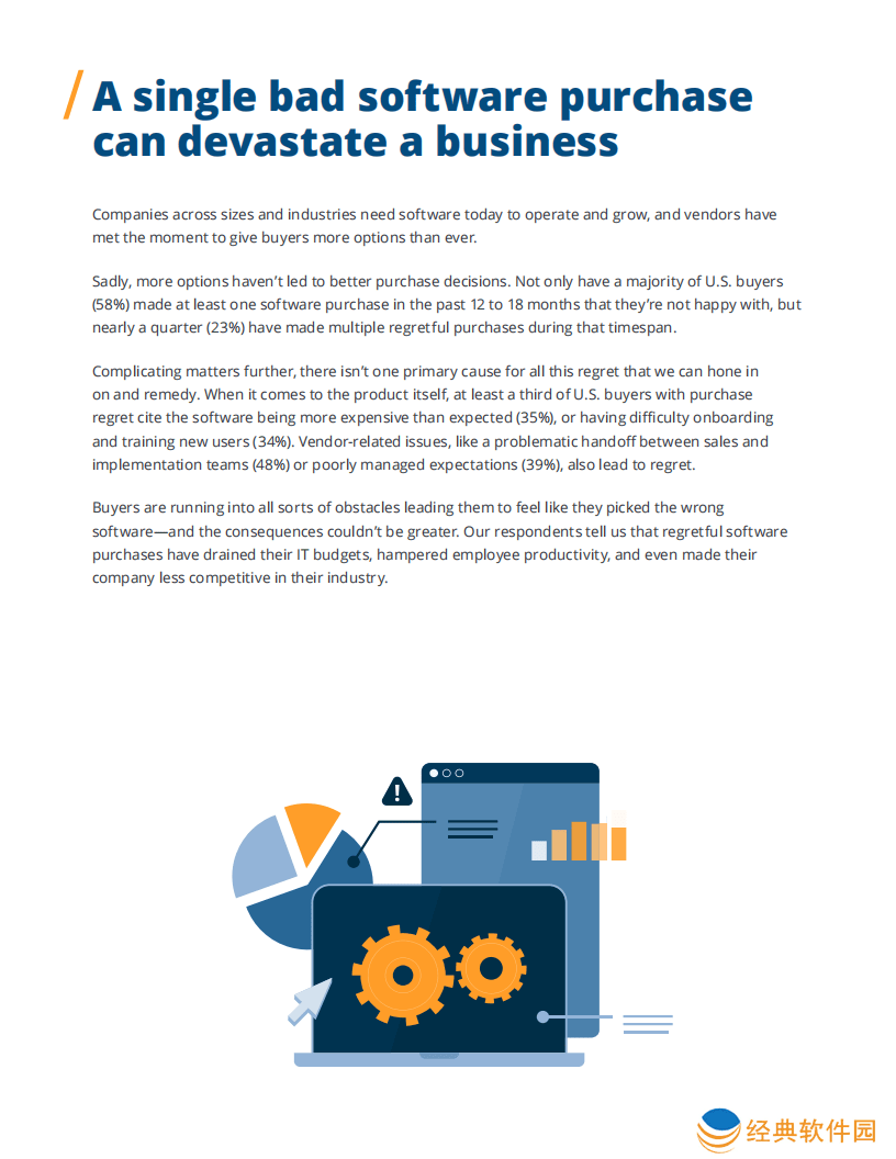 报告显示,高达58%的企业对其近期的软件采购决策表示后悔。这些后悔的企业普遍认为,错误的采购决策不仅对企业的财务状况造成了重大影响,还削弱了企业的竞争力和生产力。例如,一些企业因采购不当而耗尽了IT预算,导致员工效率下降,进而影响了整体绩效。