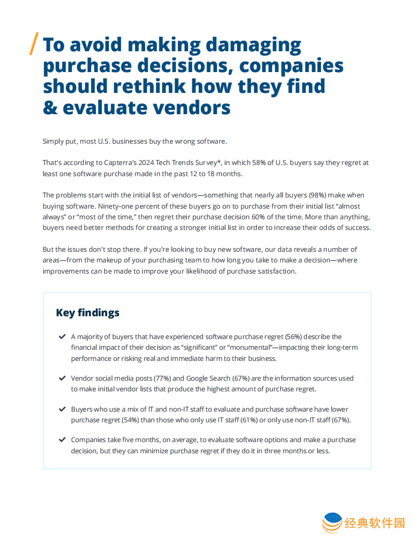 为了帮助企业更好地应对这些挑战,报告建议企业应改变采购方式,遵循报告中的建议,以避免后悔。同时,企业可以借助Capterra平台获取软件信息和咨询服务,以做出更加明智的采购决策。