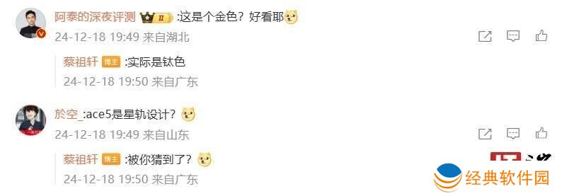 在@蔡祖轩分享的图片中,一加Ace 5手机的外观设计首次亮相。面对网友对新机的好奇,他在评论区积极互动,解答了不少疑问。对于网友询问Ace 5是否采用金色配色,他澄清说实际为钛色,更显高端质感。当被问及Ace 5是否采用独特的星轨设计时,他则以神秘的方式回应:“被你猜到了?”