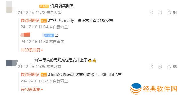 面对网友们的热情询问,@数码闲聊站也在评论区进行了积极的回复。对于大家关心的上市时间,博主表示OPPO Find N5已经准备就绪,预计将在第一季度正式发售。而对于无线充电功能的疑问,博主则确认Find系列已经标配了无线充电和防水功能,连X8 mini也不例外。