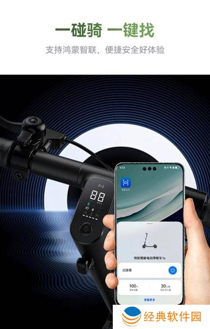 在智能化方面,这款滑板车同样表现出色。它支持鸿蒙智联技术,只需简单一碰,手机即可自动弹出解锁功能键,实现快速解锁。近场寻车功能也大大提升了用户的便利性,一键即可启动蜂鸣告警和灯光闪烁提示,让滑板车在停车区域中迅速脱颖而出。滑板车在关机时还会自动记录停放位置,方便用户随时查看;开机时,则会自动检测8大部件状态,确保骑行安全无忧。