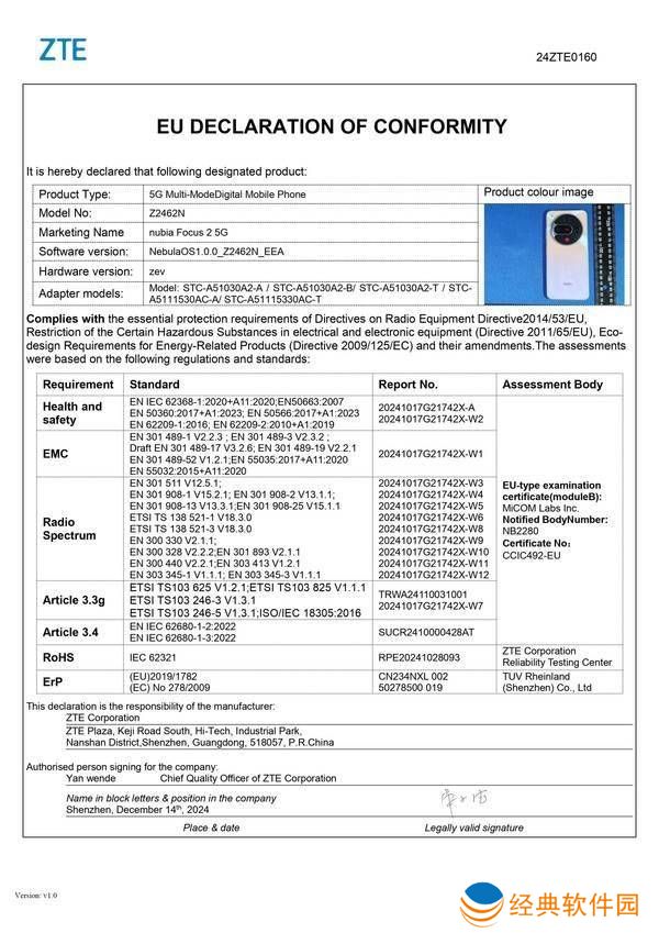 据国际媒体报道,努比亚Focus 2不仅成功通过了多个权威认证平台的严格审核,其真机图片也首次公开亮相,揭开了这款神秘新机的面纱。欧盟合规声明文件显示,努比亚Focus 2的型号为Z2462N,被定义为支持5G多模技术的数字手机,认证编号为CCIC492-EU。这一声明伴随着真机照片的曝光,让消费者对这款新机有了更为直观的认识。