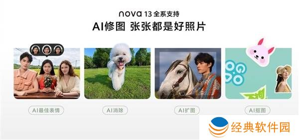 在AI修图方面,华为nova 13系列同样表现出色。支持AI扩图、AI消除、AI智慧抠图等功能,让用户轻松拯救相册中的“废片”。配合首发的AI最佳表情功能,拍摄时可从连拍照片中挑选最佳表情,利用AI智能技术进行修补,确保画面更自然,合成完美的合影照片。