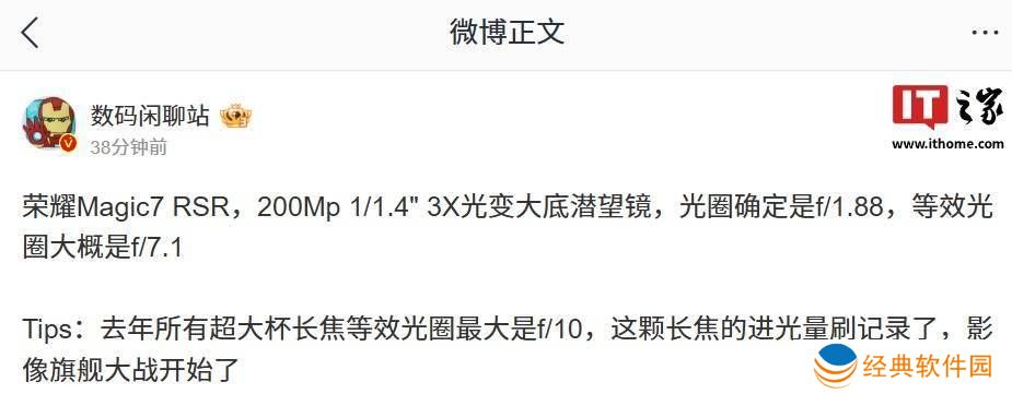 知名数码博主@数码闲聊站也在其社交媒体上透露了更多关于Magic7 RSR保时捷设计版的细节。据悉,这款手机配备了2亿像素的1/1.4英寸3倍光学变焦潜望镜头,其光圈达到了f/1.88,等效光圈更是达到了惊人的f/7.1。博主特别强调,这一长焦镜头的进光量刷新了去年的记录,即便是去年所有超大杯长焦镜头中,等效光圈最大的也仅为f/10。