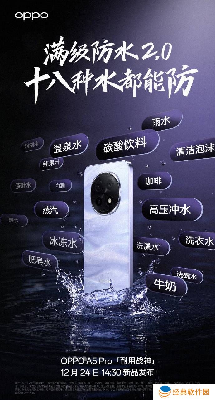 OPPO近日揭晓了其最新力作——OPPO A5 Pro,一款被誉为“耐用战神”的新机,将在12月24日14:30正式发布。这款新机不仅在耐用性上再度突破,更在防水技术上实现了前所未有的飞跃,正式推出“满级防水2.0”概念。