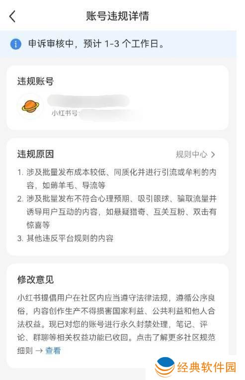 从用户晒出的图片中不难发现,被封号的理由五花八门。有的账号因“涉及批量发布低成本、同质化内容并进行引流或牟利,如薅羊毛、导流等行为”被封;有的则因“在笔记或评论中频繁夸大事实、编造故事、题文不符等低质量营销手法来推广商品或服务,以及频繁引导用户至第三方平台”而遭到处罚。