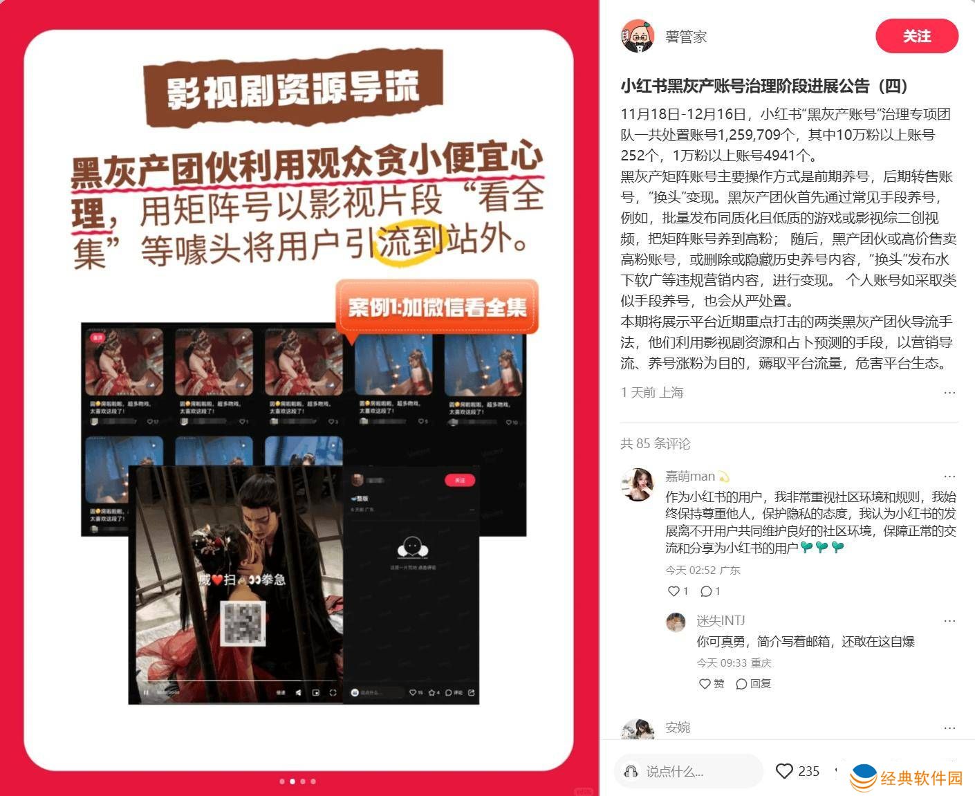 而在12月19日,小红书官方再次发布了黑灰产账号治理的进展公告。自11月18日至12月16日,小红书的“黑灰产账号”治理专项团队共处置了1,259,709个账号,其中包括252个十万粉以上的账号和4941个一万粉以上的账号。这些黑灰产矩阵账号主要通过前期养号,后期转售账号或“换头”发布违规营销内容进行变现。
