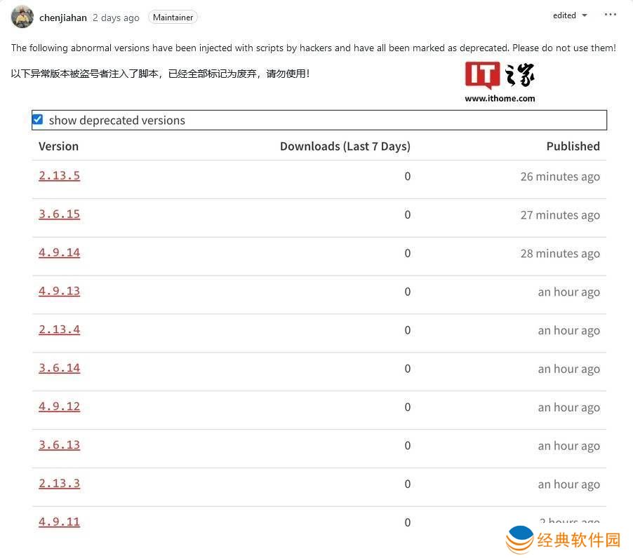 具体来说,官方紧急废弃了以下版本,并提醒用户切勿使用:4.9.14、4.9.13、4.9.12、4.9.11、3.6.15、3.6.14、3.6.13、2.13.5、2.13.4和2.13.3。同时,官方团队发布了新的安全版本,包括4.9.15、3.6.16和2.13.6,npm的latest tag也已经指向了这些新版本。