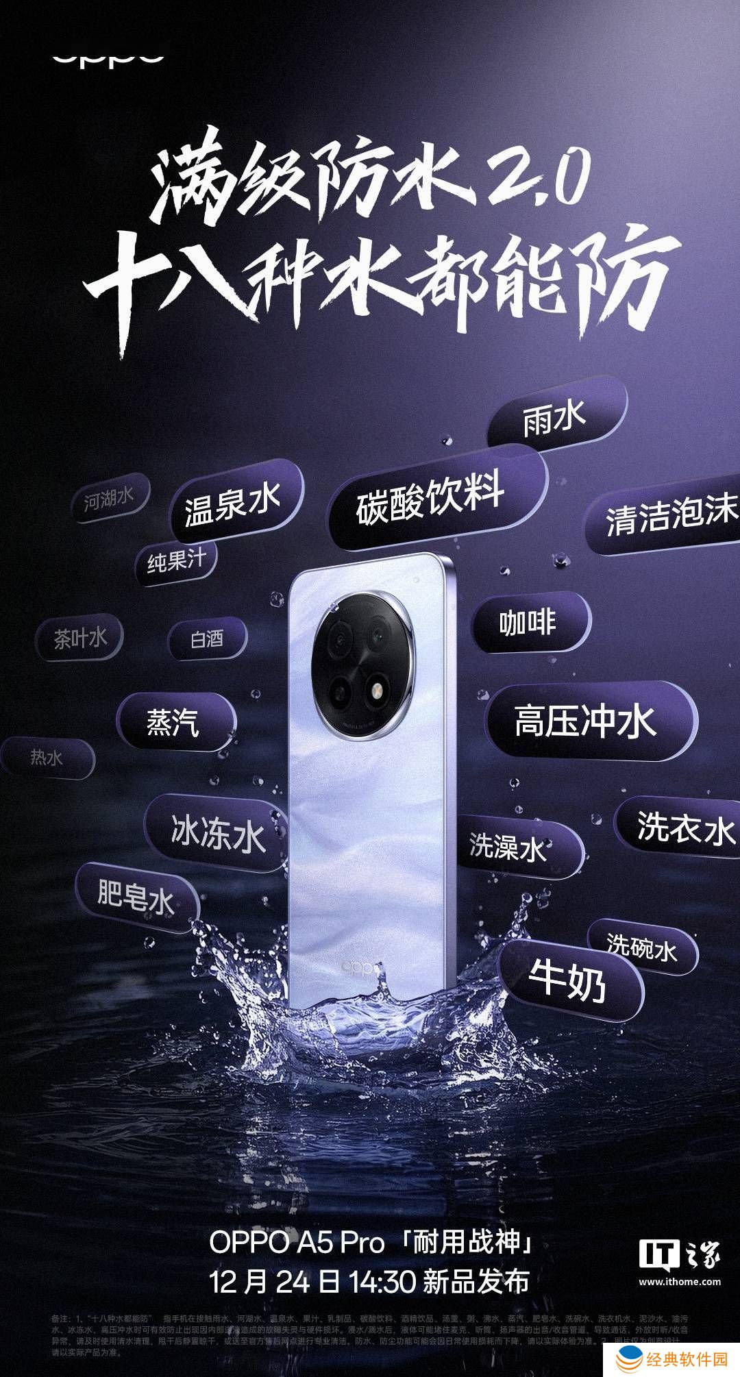 OPPO A5 Pro手机近日正式宣布,其将支持一项名为“满级防水2.0”的技术,声称能够抵御“十八种水”的侵袭。这一消息引发了市场的广泛关注。