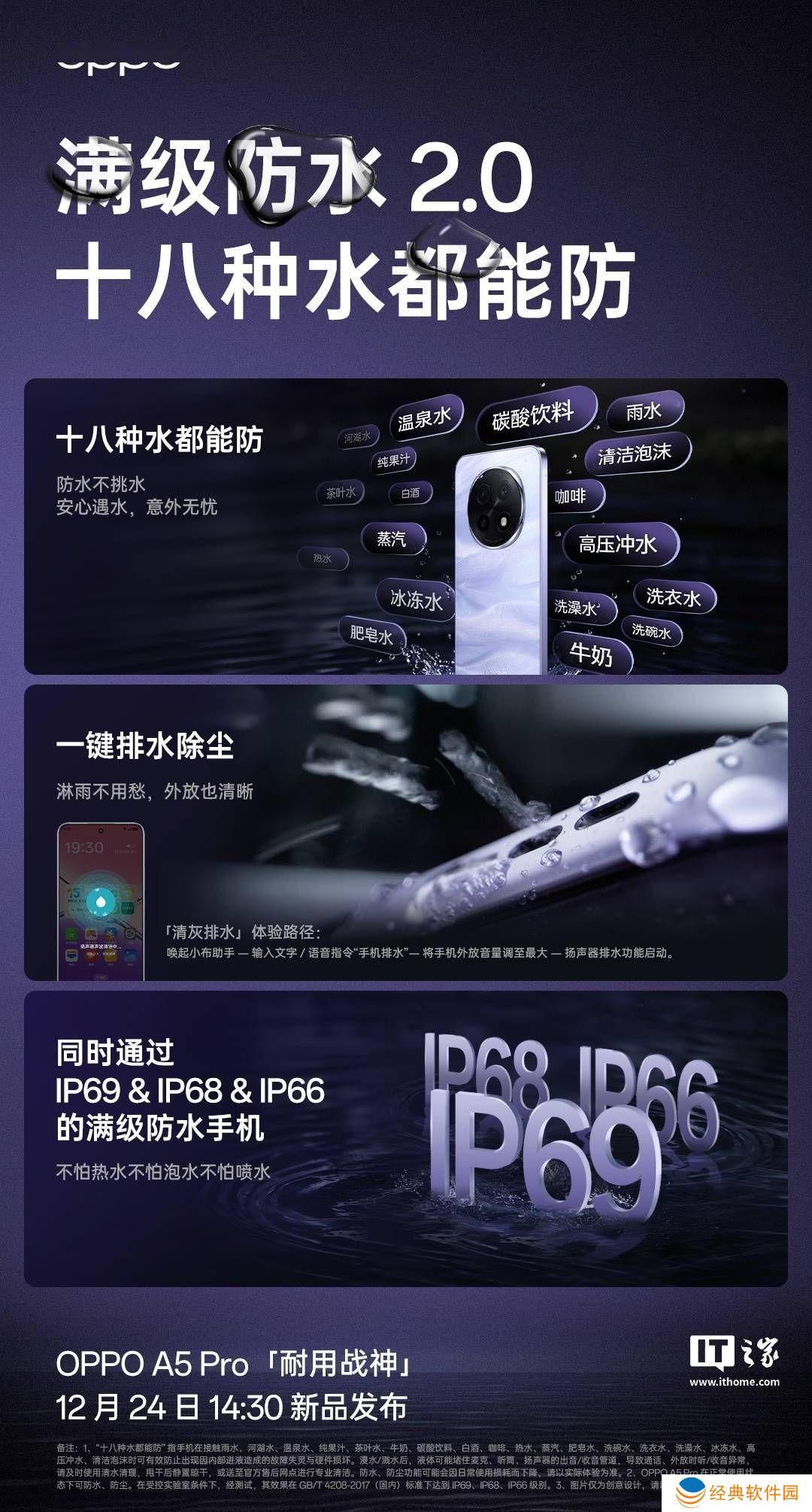 海报详细列出了手机能防的十八种水,显示了OPPO对于防水功能的信心。然而,OPPO也提醒用户,在浸水或溅水后,液体可能会暂时堵塞麦克、听筒或扬声器,影响通话和外放效果。对此,OPPO建议用户及时使用清水清理,并静置晾干,或者送到官方售后网点进行专业处理。
