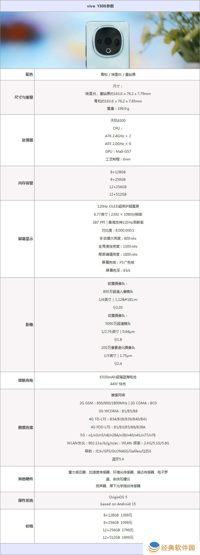 vivo Y300在外观设计上也颇具亮点,其青松配色采用了40°黄金四曲后盖和丝光绣影工艺,带来柔和贴手的握持体验。同时,其40°黄金四曲后盖通过高压成型工艺实现了横竖握持时的完美贴合,边缘柔和,手感圆润。vivo Y300还配备了6.77英寸的120Hz OLED屏幕,支持3480Hz高频PWM护眼能力,确保了全天候全方位的护眼效果。
