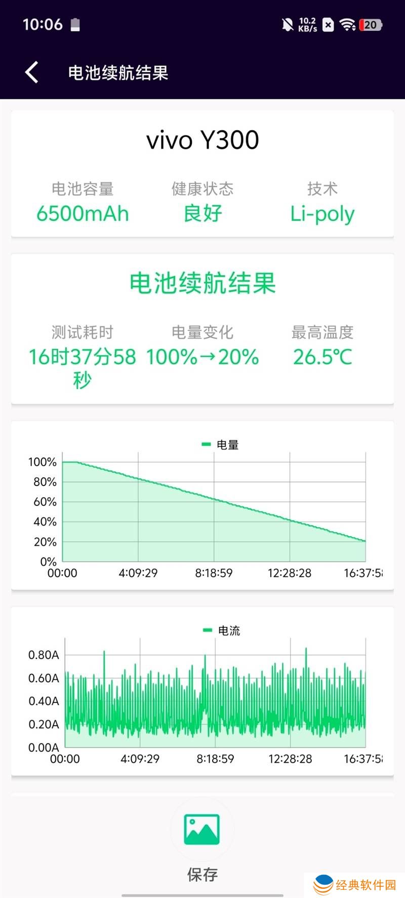 在续航测试中,vivo Y300表现出色,通过专业续航测试工具电池狗狗的测试,手机电量从100%消耗至20%坚持了16小时37分58秒,相比上一代Y200的续航成绩增加了约3.5个小时,整体续航时间可达20小时47分钟左右,一举夺魁电池狗狗续航排行榜。vivo Y300还支持最高44W有线快充,仅需半小时即可恢复近一半的电量,为用户提供了极大的便利。
