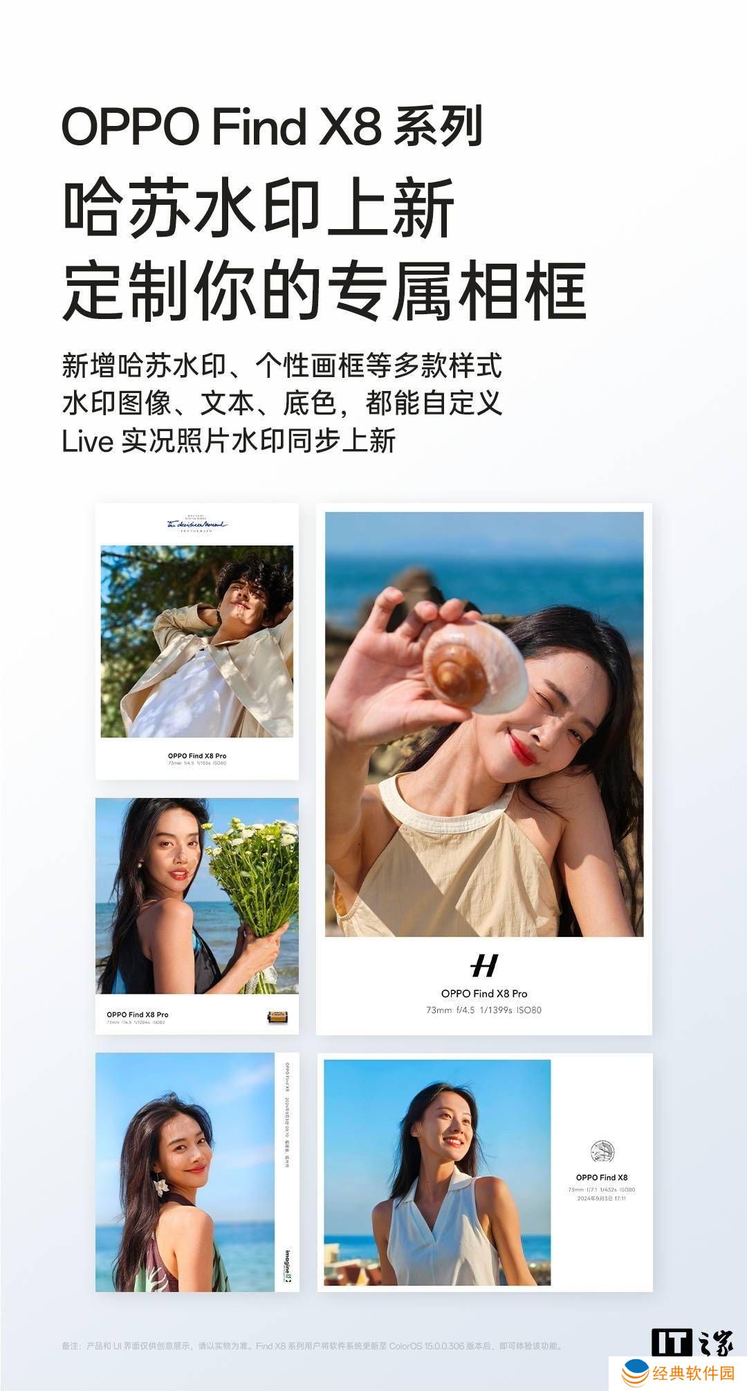 OPPO近日在Find X8系列手机上推出了全新的哈苏水印自定义功能,为用户提供了更为个性化的拍照体验。据悉,Find X8系列的用户在将软件系统更新至ColorOS 15.0.0.306版本后,即可享受到这一创新功能。无论是水印图像、文本还是底色,用户都可以根据自己的喜好进行自由定制,甚至Live实况照片的水印也支持个性化设置。