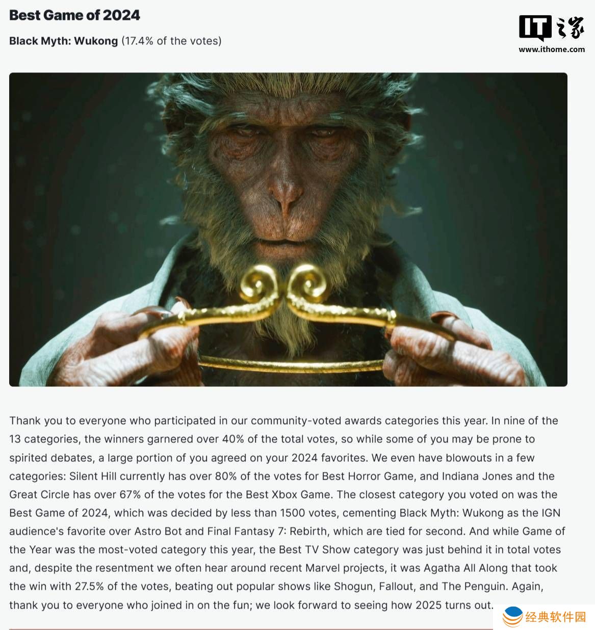 《黑神话:悟空》不仅在此次IGN社区投票奖中表现出色,还在此前多次获得重要奖项的认可。它已陆续拿下2024金摇杆奖年度游戏大奖及“最佳视觉设计”奖、2024拉美游戏奖“年度游戏”“最佳PC游戏”奖以及TGA 2024最佳动作游戏奖及“玩家之声”奖。这些荣誉的获得,不仅证明了《黑神话:悟空》的卓越品质,也为中国游戏产业的发展树立了新的标杆。