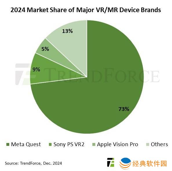 在众多品牌中,meta的Quest系列凭借其广泛的用户基础与高性价比,成功占据了市场的头把交椅,市场份额高达73%。特别是Quest 3S,凭借其299美元的亲民价格策略,吸引了大量消费者的关注与购买,其出货量与前一年相比增长了11%。