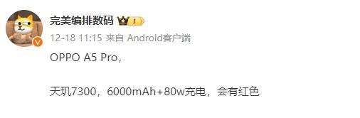 OPPO A5 Pro将配备一块6000mAh的大容量电池,相比前代A3 Pro的5000mAh有了显著提升,同时快充技术也从67W升级至80W,为用户带来更持久的使用时间和更快的充电体验。这一改进无疑将满足那些对手机续航有较高要求的用户。