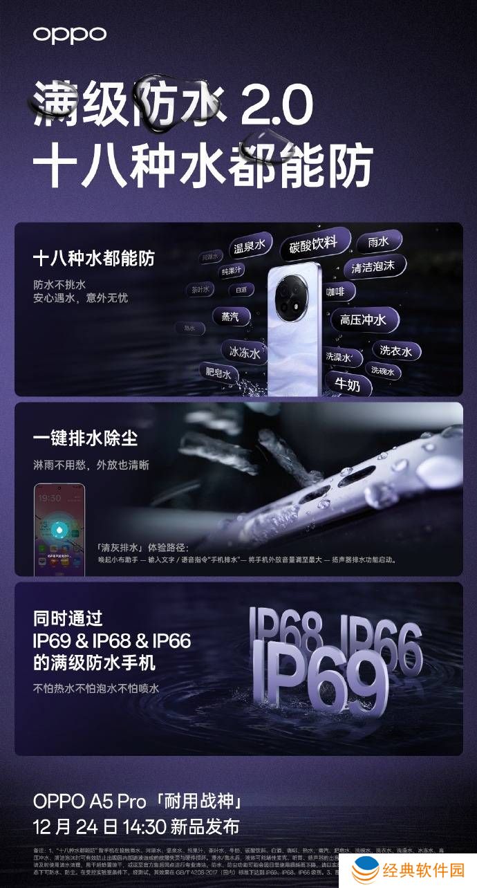 OPPO A5 Pro不仅在性能和续航上表现出色,其耐用性也同样令人瞩目。这款新机通过了14项国家军用标准测试,能够在极端温度、积雨、积冰、冻雨和流体污染等多种恶劣环境下保持正常运行。同时,它还具备防尘防水的功能,通过了IP69、IP68和IP66的防尘防水等级认证,并支持一键排水除尘功能,能够抵御十八种不同类型的水侵害。
