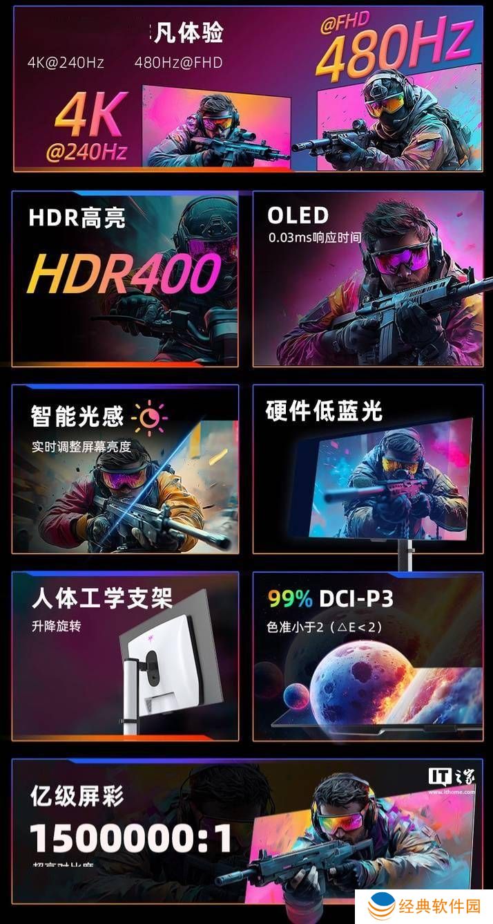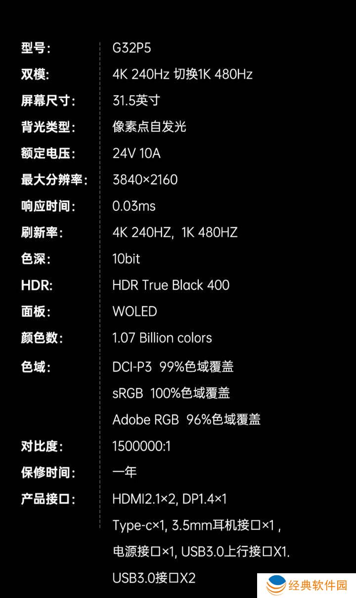 G32P5的核心亮点在于其搭载的LG WOLED面板,这块面板能够支持两种高分辨率高刷新率的显示模式:4K分辨率下达到240Hz,或在FHD分辨率下飙升至480Hz。这样的配置无疑为游戏爱好者和专业设计师提供了极致的视觉体验。0.03ms的响应时间、1000尼特的峰值亮度以及高达150万:1的动态对比度,使得这款显示器在色彩表现和画面细节上均达到了顶尖水平。