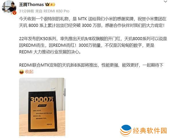 近日,小米中国区市场部的一位高层管理人员,同时也是REDMI品牌的掌舵者王腾,在社交媒体上分享了一个特别的瞬间。他晒出了一块由MTK(联发科)赠送的感谢奖牌,以此庆祝小米集团在天玑8000系列处理器上的手机出货量成功突破了3000万大关。这一里程碑式的成就不仅彰显了小米与联发科之间紧密的合作关系,也进一步体现了REDMI品牌在推动行业发展方面的坚定决心。