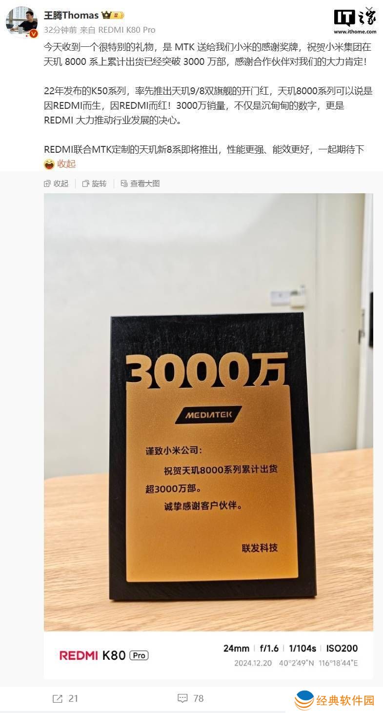近期,小米中国区市场部的重要人物、REDMI品牌的领航者王腾,在社交媒体上自豪地展示了一枚奖牌,标志着小米集团在天玑8000系列芯片上的出货量已经惊人地达到了3000万部的里程碑。