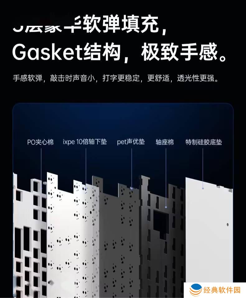 在键盘的设计上,迈从G87也下足了功夫。其采用了Gasket结构,通过PO夹心棉、ixpe 10倍轴下垫、pet声优垫、轴座棉以及特制硅胶底垫五层填充,为用户带来了出色的音质体验。键盘的前高为19mm,并配备了两段可调脚撑,用户可以根据个人习惯进行调整。