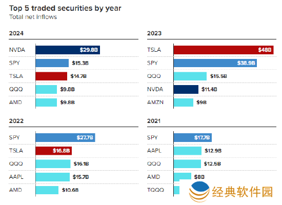英伟达在2024年的净零售流入量也实现了显著增长,比三年前增长了885%以上。这一数据再次证明了散户投资者对英伟达的强烈兴趣和热情。