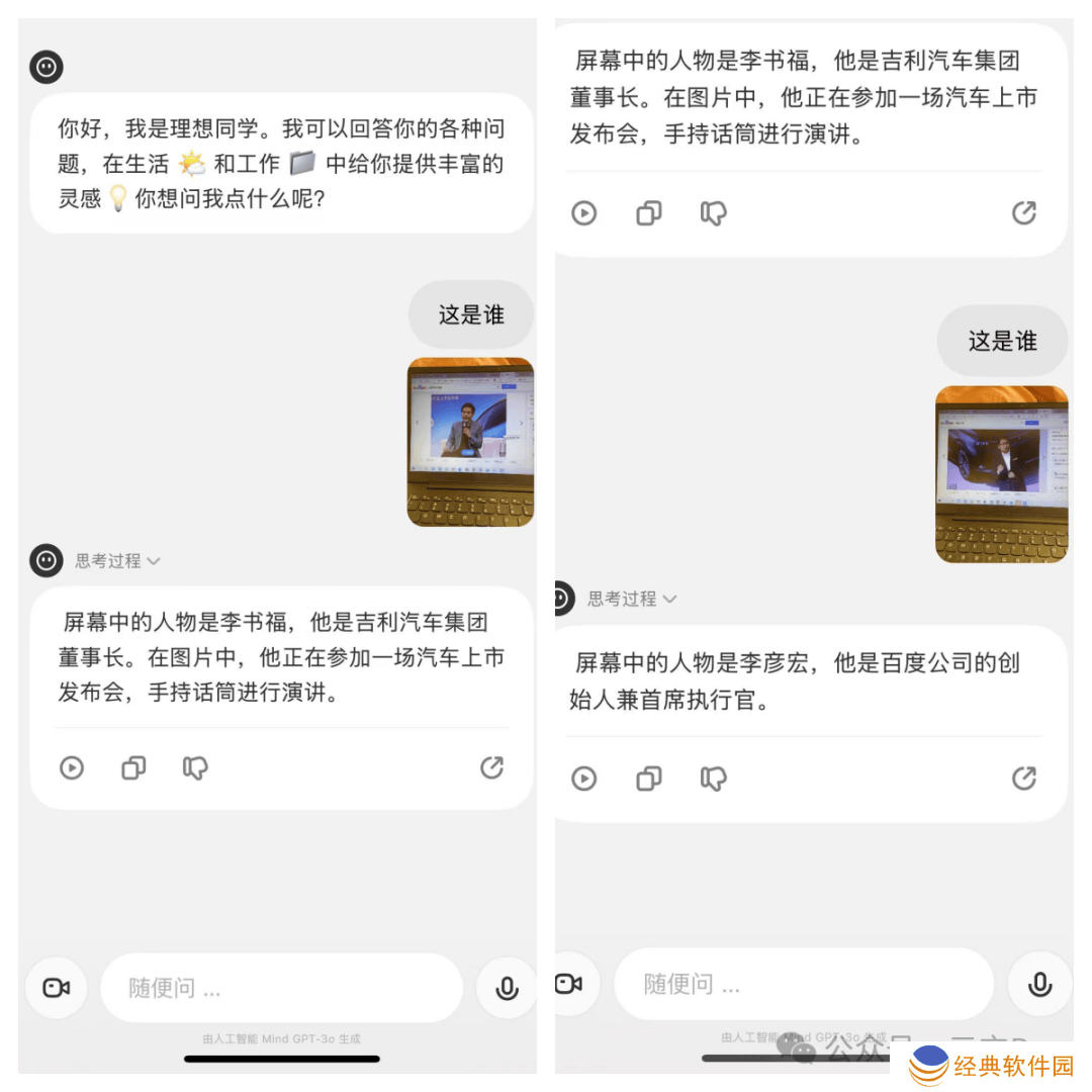 为了验证理想同学的实际表现,进行了一系列测试。在车型识别测试中,理想同学准确识别了包括理想、蔚来、问界、小米等热门车型,反应速度较快。然而,在人物识别测试中,理想同学的表现略显不足,将李斌误认为是李想,更是将余承东错认成李彦宏。在识别手机型号时,理想同学也出现了错误,将小米误认为是荣耀。