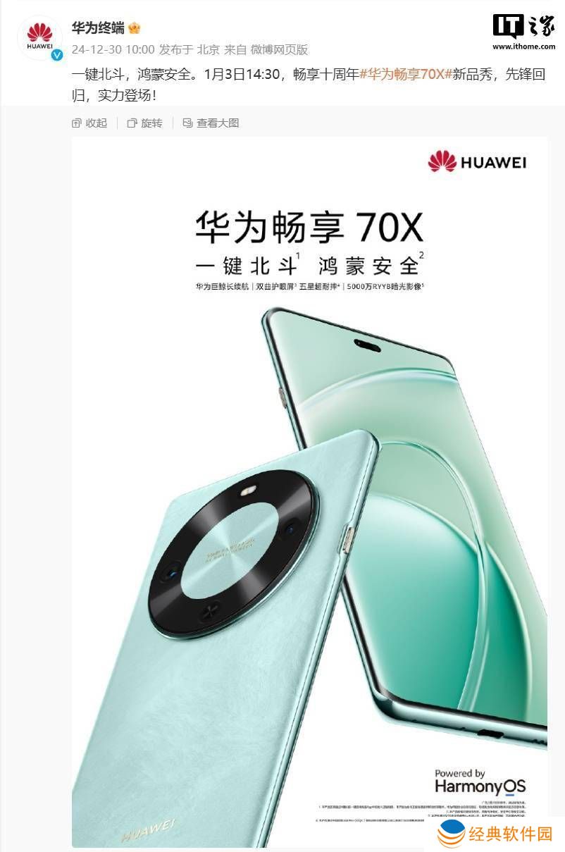 华为公司近日正式宣布,其全新的畅享70X智能手机将于2025年1月3日下午14点30分正式发布。这款手机的宣传口号为“一键北斗,鸿蒙护航”,彰显了其在卫星通讯和操作系统安全方面的创新。