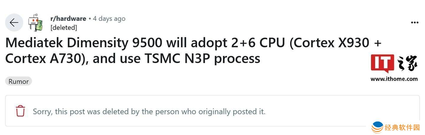 在Reddit论坛上,一个发布于本月26日但随后被删除的帖子也提到了与天玑9500相关的信息。根据帖子中的引用内容,Cortex-X930和Cortex-A730预计将支持ARMv9.4指令集,其中X930将配备高达12个宽解码器。这一配置将进一步增强处理器的运算效率和指令处理能力。