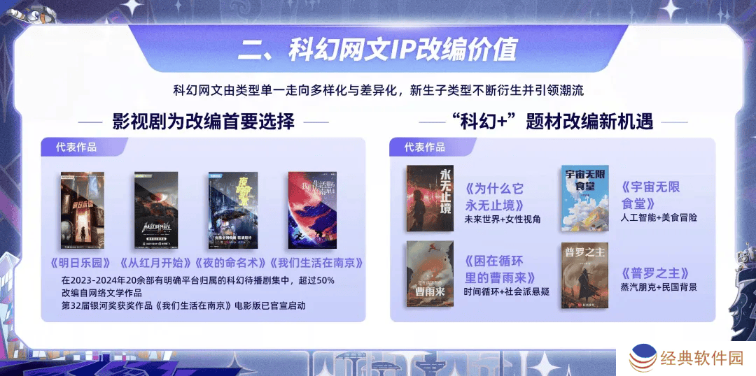 科幻网文作为新兴品类,其发展势头强劲。不仅产量与质量迅速提升,还连续八年有作品获得中国科幻最高奖“银河奖”。在影视化方面,科幻网文也展现出了巨大的潜力,多部改编自科幻网文的剧集正在筹备或拍摄中。