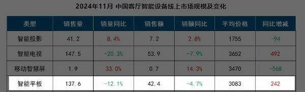 近期,洛图科技公布的11月份《中国客厅智能设备线上零售数据月报》揭示了智能平板市场的最新动向。数据显示,2024年11月,中国智能平板线上市场销量达到了137.6万台,但与去年同期相比,这一数字下降了12.1%。销售额方面,虽然达到了42.4亿元,但也遭遇了4.7%的同比下滑。