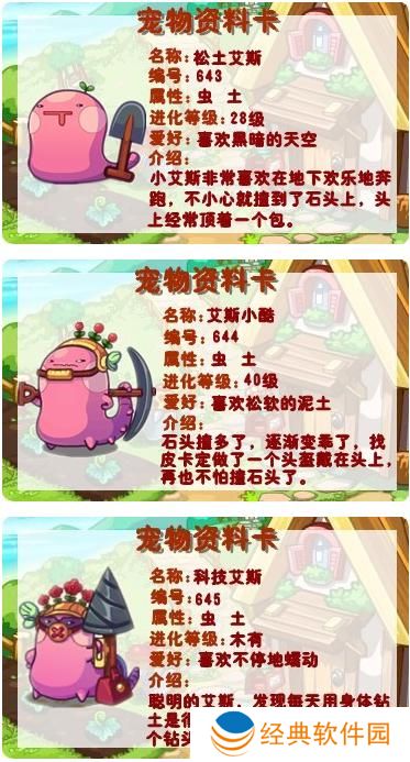 进化:松土艾斯在达到特定等级后会进化。具体进化路线为:松土艾斯(初始)→艾斯小酷(28级)→科技艾斯(40级)。