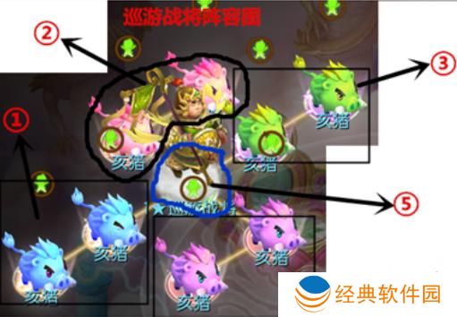 绿色小猪:辅助门派,使用群体攻击技能,位于法术连击法阵,可触发法连。