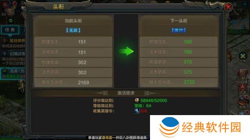 评分达到一定要求:例如,从无双头衔升级到傲视头衔时,评分需求需达到52000。