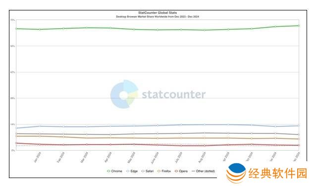 在最新的全球浏览器市场格局中,谷歌Chrome浏览器再次证明了其不可撼动的地位。根据Statcounter的最新数据揭示,2024年12月,Chrome以66.88%的市场份额高居榜首,不仅环比增长0.5%,同比也实现了1.65%的增长,进一步稳固了其在浏览器领域的霸主地位。