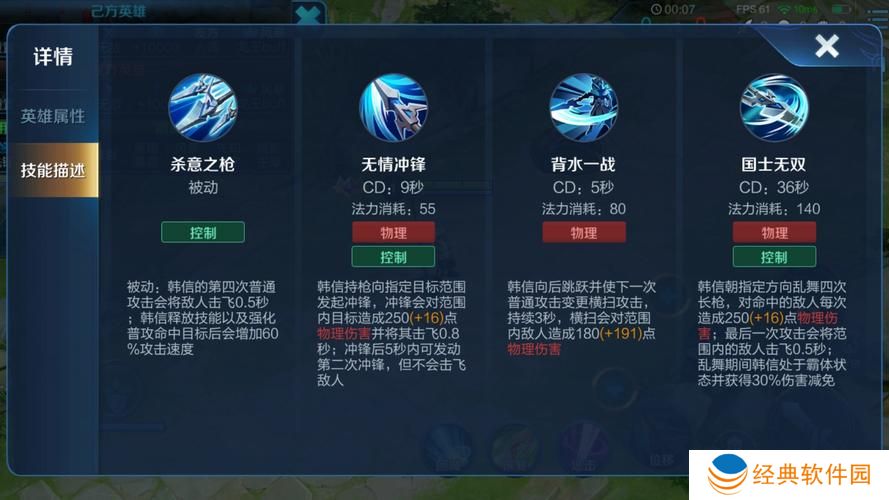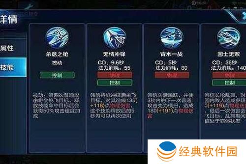 一技能(无情冲锋):韩信持枪冲锋后挑飞目标,对其造成物理伤害,这个技能释放后的5秒内可以再次使用。这是韩信的主要位移和突进技能,用于快速接近敌人或逃离战场。