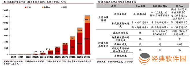 从技术趋势来看,激光雷达主要分为固态激光雷达、混合固态激光雷达和机械式激光雷达。由于机械激光雷达结构复杂、可靠性较差且寿命不足,目前在车载领域的应用较少。混合固态激光雷达(如转镜式、MEMS振镜)相对成熟,是当前和未来车载激光雷达的主流方案。而固态Flash方案正在逐步产业化,其在车载领域的占比持续提升。尽管纯固态Flash雷达目前主要应用于补盲,尚未兼顾FOV和远距离测量,但长期来看,由于其体积和耐久度的优化,有望成为最优选择。