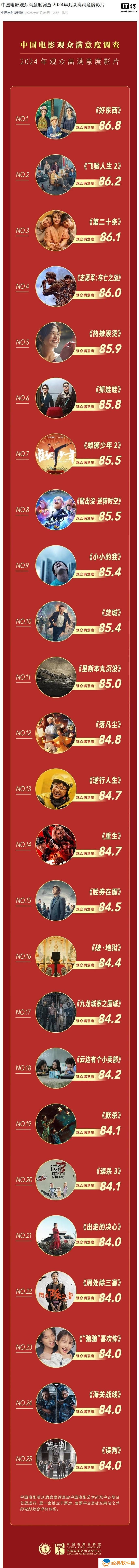 在这份榜单中,《好东西》以86.8分的优异成绩荣登榜首,成为观众心中最满意的影片。紧随其后的是《飞驰人生 2》,它以86.2分紧随其后,而《第二十条》则以86.1分位居第三。《志愿军:存亡之战》和《热辣滚烫》分别以86.0分和85.9分位列第四和第五名。
