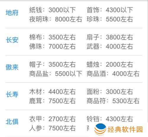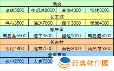 地府:首饰(4300以下)、纸钱(3000以下)、夜明珠(8000以下)、珍珠(5500以下)。