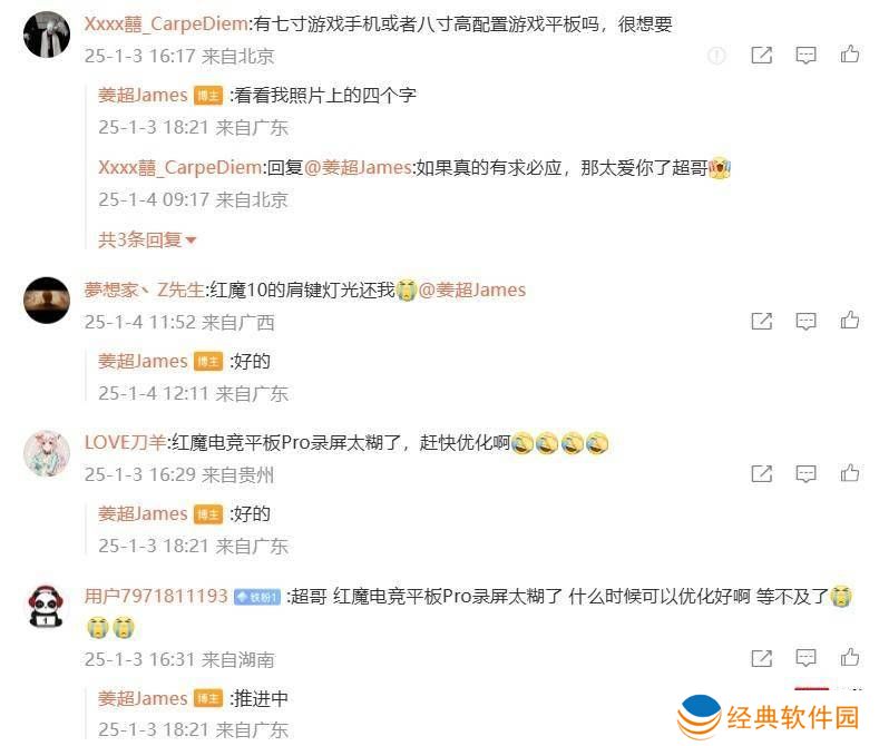 姜超在发布这一消息后,积极与网友进行互动,对大家的疑问和期待进行了回应。对于网友提出的是否会推出七寸游戏手机或八寸高配置游戏平板的问题,他巧妙地引导大家关注他照片上的四个字,虽然具体内容未直接透露,但这一举动无疑增加了大家对新品的期待。