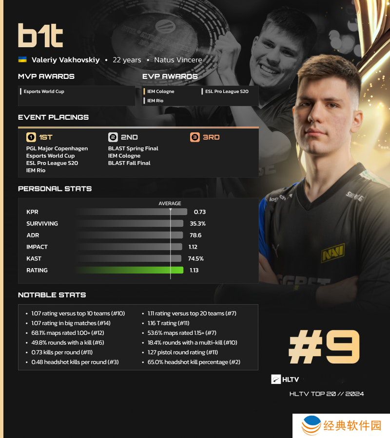 b1t凭借在NAVI成功之年中的一系列出色表现,成功跻身年度Top 20选手榜单第9名。从PGL哥本哈根Major夺冠开始,到他们在新加坡的总决赛连胜纪录终结,b1t始终是队伍的核心力量。