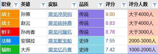 孙策的皮肤质量是很高的。尤其在传说皮这块,目前游戏内共有5个四传说英雄,他们的全传说皮平均分分别是:孙尚香8.05、孙策7.89、王昭君7.56、貂蝉7.21、吕布6.72. 孙策在其中排名第**近八分门槛,足见传说实力。